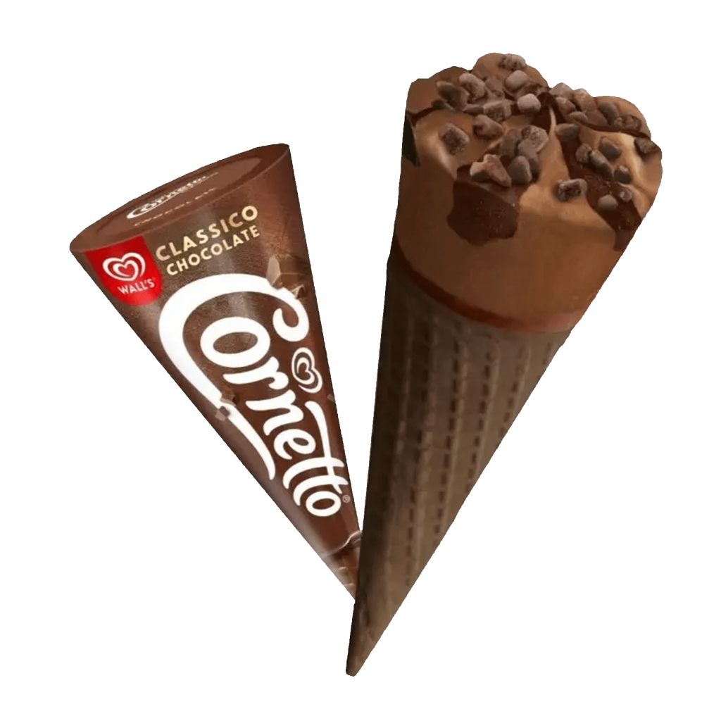 Cornetto é um gelado clássico que combina um delicioso gelado cremoso com uma bolacha crocante em forma de cone, finalizado com uma cobertura saborosa. A harmonia entre a textura suave do gelado e a crocância do cone proporciona uma experiência equilibrada e irresistível, tornando o Cornetto a escolha ideal para quem aprecia um gelado divertido, prático e cheio de sabor.